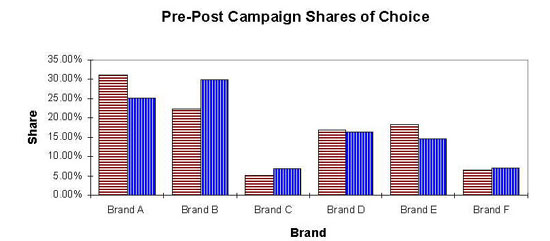 Here we see that Brand B, the promoted brand, improved share of choice from 22% to 30%. Brands A, D, and E showed a decline, while brands C and F showed a slight increase. Scanner data verified the direction and magnitude of the changes, in market.