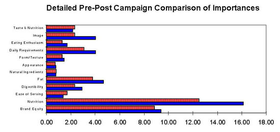 In figure 5 we see that brand B's campaign actually changed the importance respondents placed on several performance attributes for all products in the category, especially performance image of the brands, whether the brands meet complete daily requirements, having lower fat, and complete, balanced nutrition. The importance of brand equity also improved somewhat.
